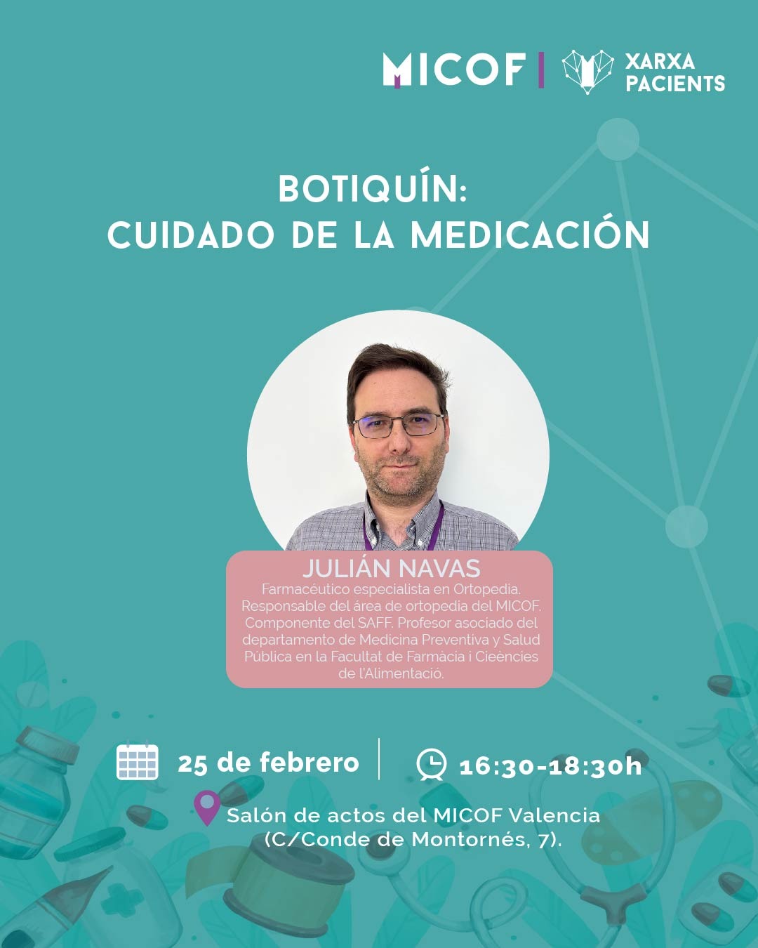 El objetivo de esta sesión gratuita es ofrecer una formación actualizada para capacitar a los pacientes en la organización, conservación y utilización correcta de los medicamentos en el entorno doméstico, favoreciendo un uso seguro y eficaz del tratamiento.